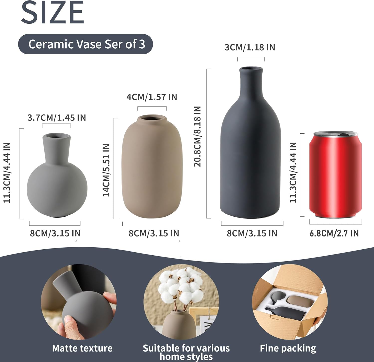- 【For Multiple Home Décor Styles】Designed in a variety of shapes and sizes, this set of vases is the perfect home décor even without flowers. Whether your style is bohemian, modern farmhouse, rustic, or homey, they all fit in perfectly show off your lifestyle and decorative sense of style. (Length X Diameter=8.3X3.1", 4.5X2.8",5.7X3.1").
