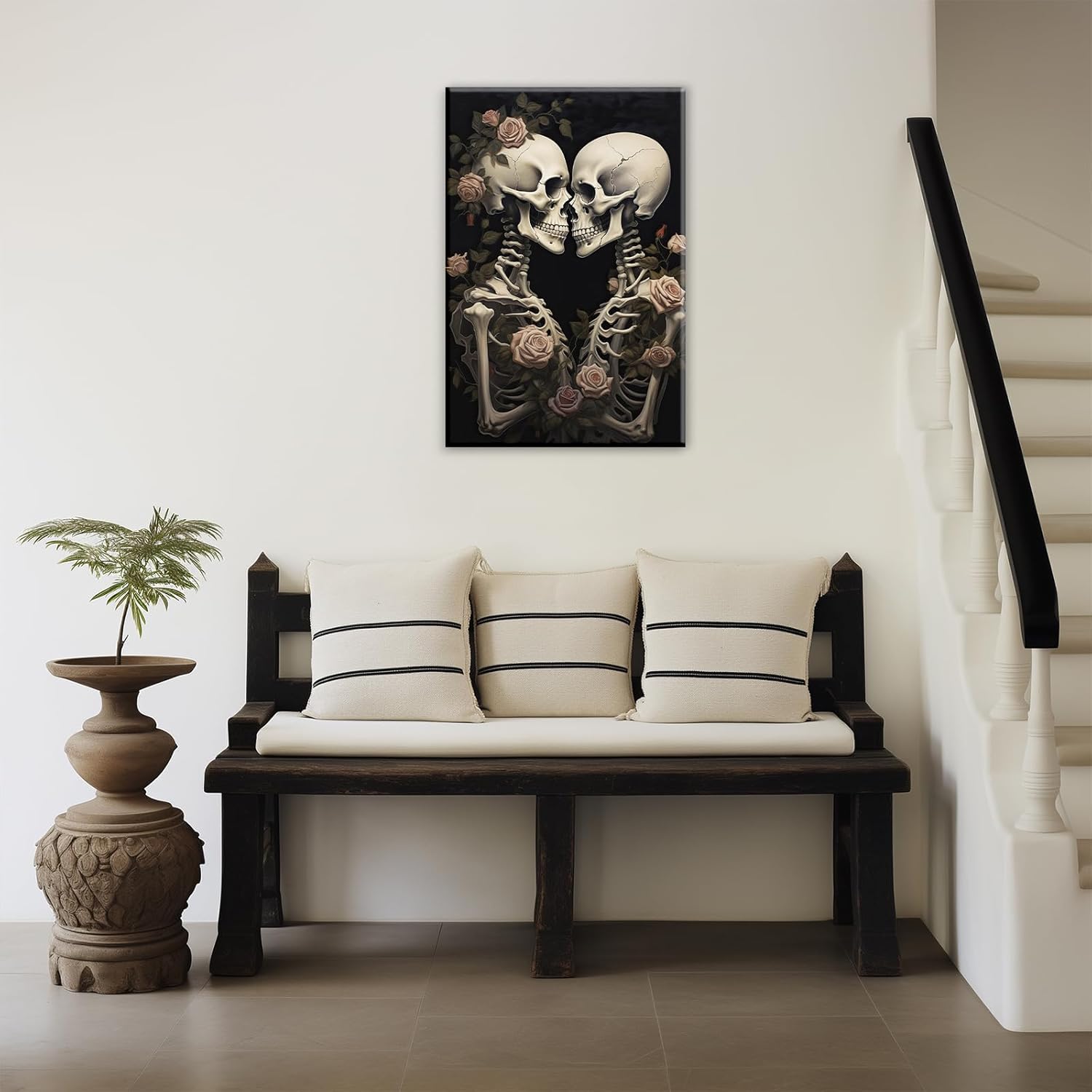 OAAPITI Vintage Skeleton Canvas Wall Art Gothic Painting Artwork Retro Rose Skull Art Poster Abstract Romantic Theme Picture Halloween Living Room Decor(Artwork-4,20"x30")