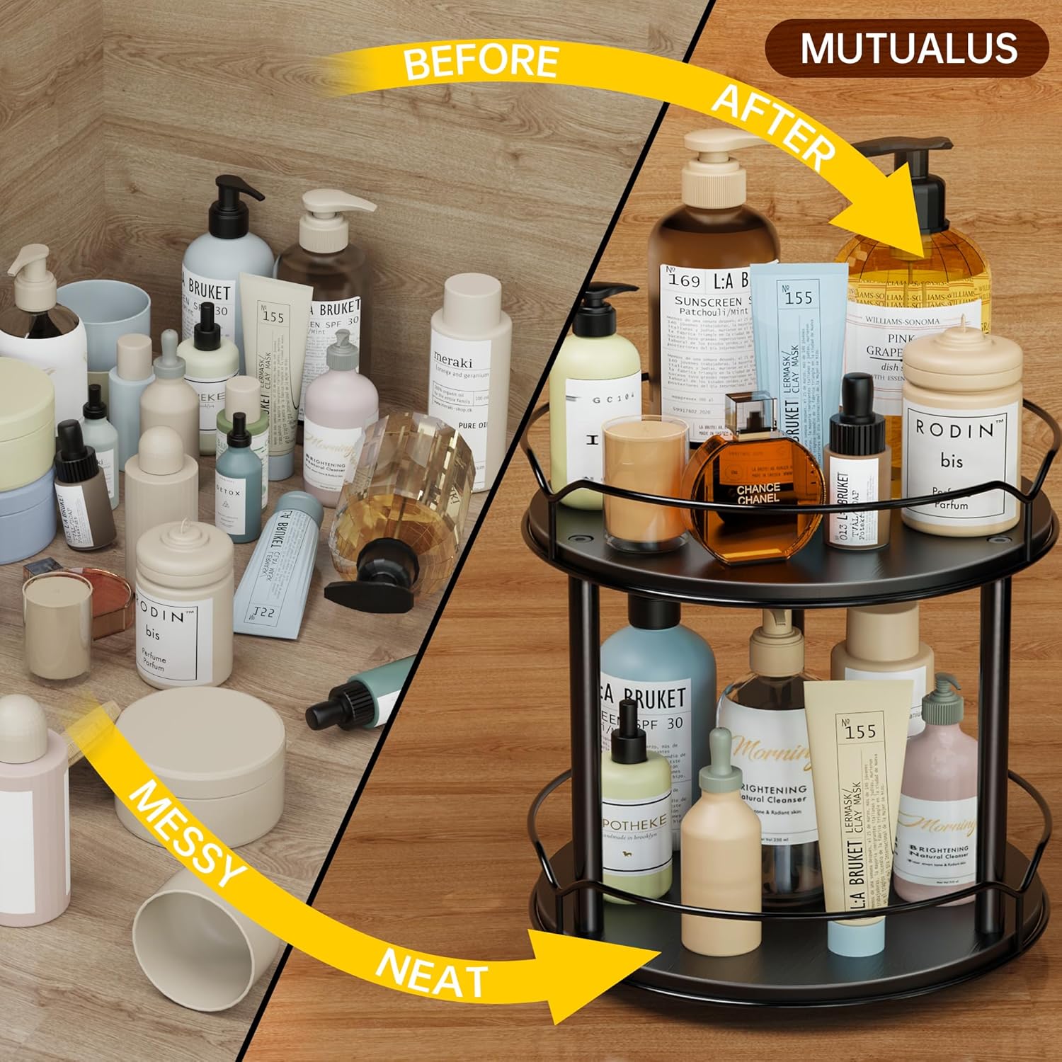 - 2. Efficient Design for Easy Access: Whether you're grabbing your favorite spices or toiletries, our Lazy Susan organizer makes it easy. The two-tier design allows for efficient storage, while the rotating design ensures easy access to all your items
