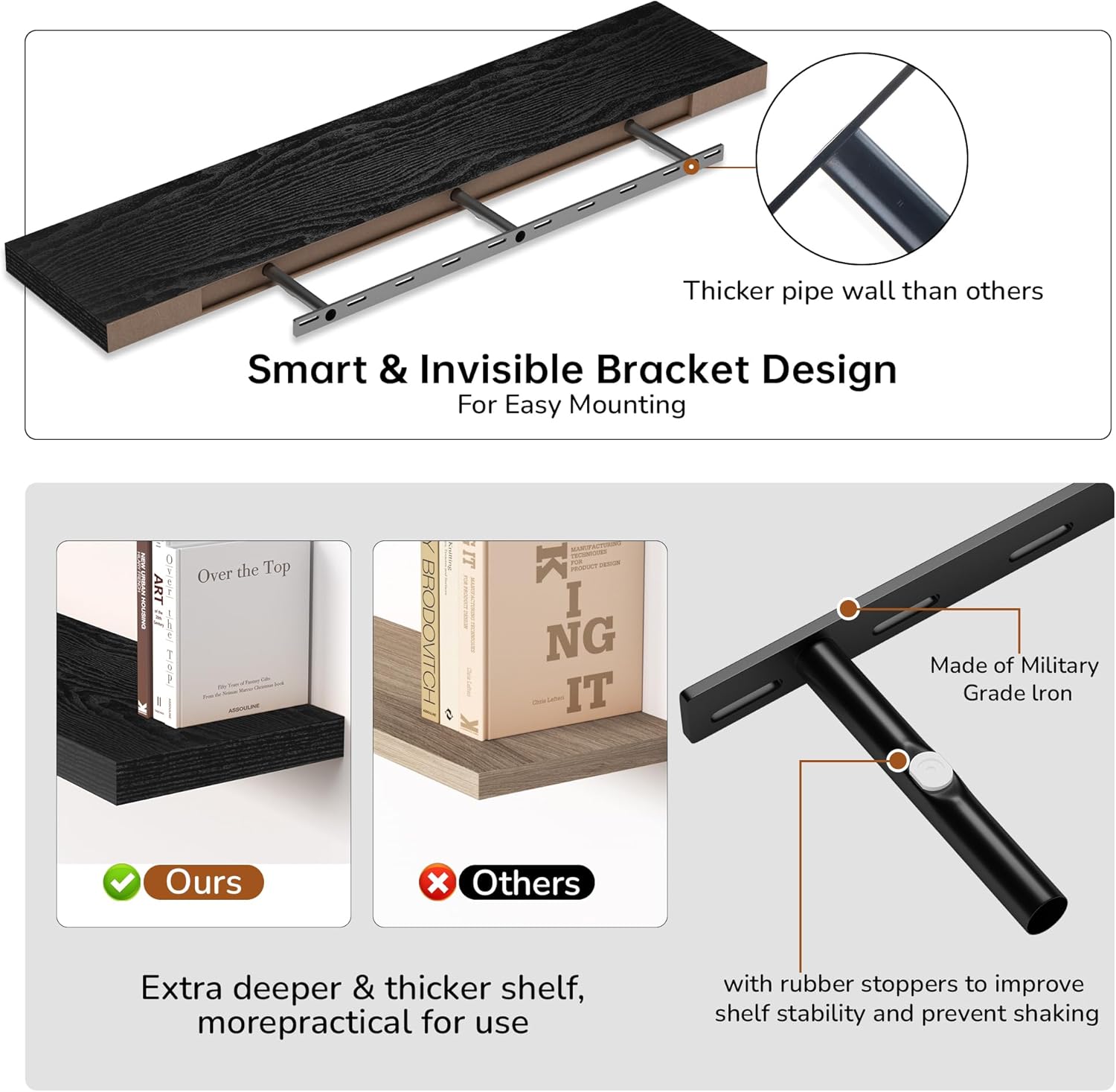 - Extra Deeper & Thicker - Each board measures 48"W x 8"D x 1.8"H. Extra deeper and thicker design in order to bring maximizes storage space and weight capacity, even hold up to 75 lb each. This floating shelf taking up zero square feet, reduces clutter and highlights décor in compact spaces.