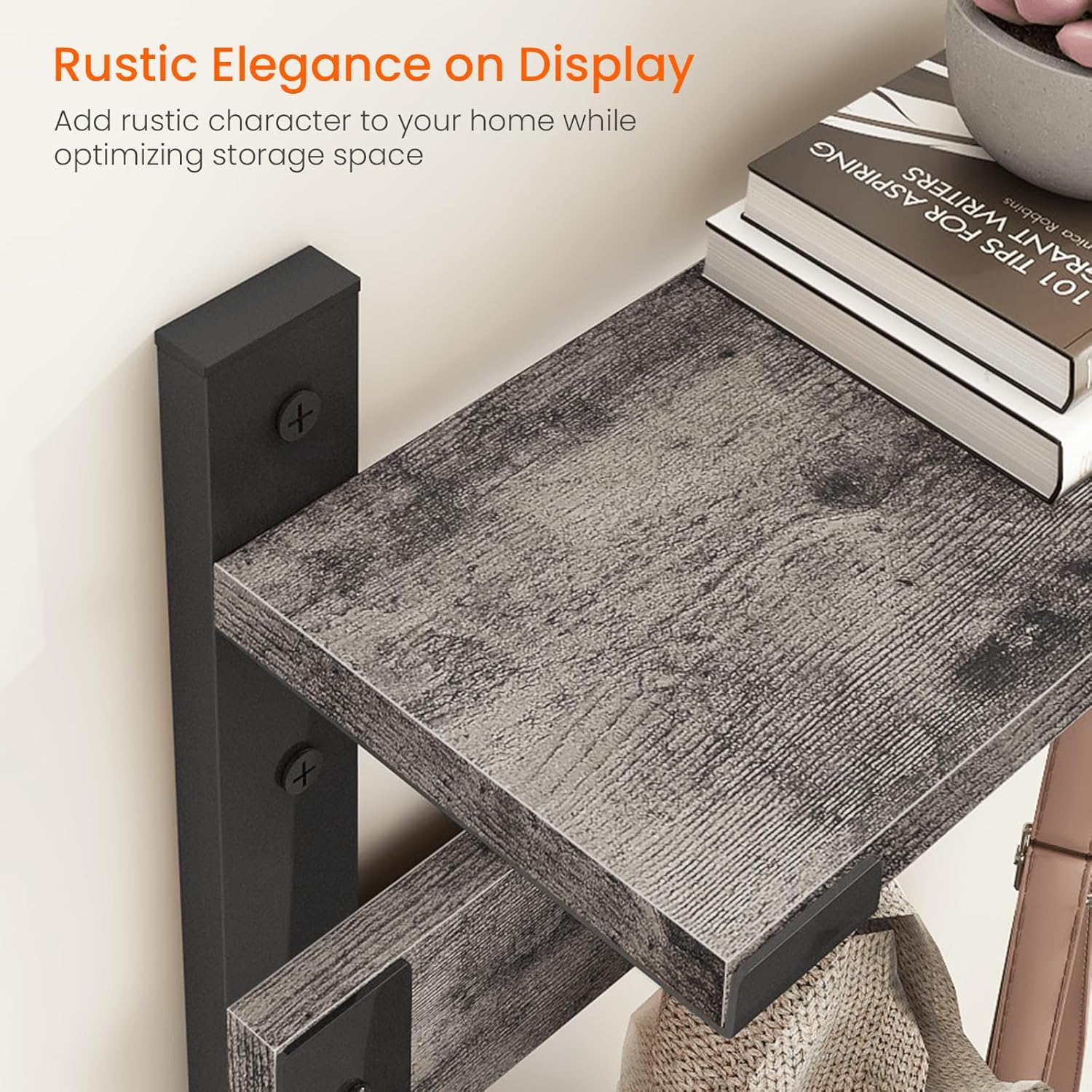 - 2 IN 1 VERSATILITY: This entryway hooks with shelf offers a blend of hanging and display functionalities. The wall mount coat rack also features a top shelf for displaying photos, plants, storing mail envelopes and other decor