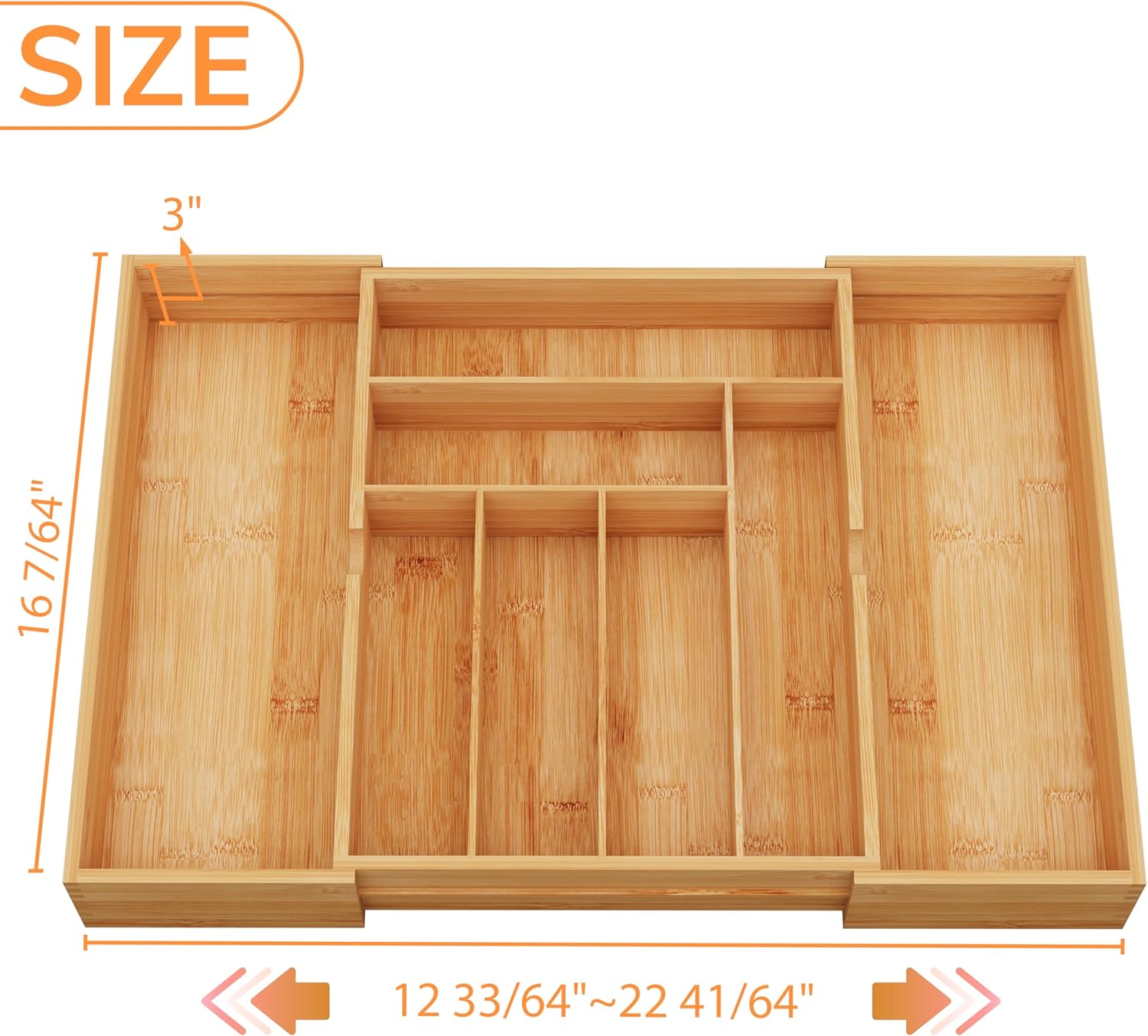 BAMEOS 3" Deepth Expandable Drawer Organizer, Deep Flatware Organizer, Adjustable Silverware Organizer, Bamboo Drawer Organizer for Kitchen, Bathroom (Natural)