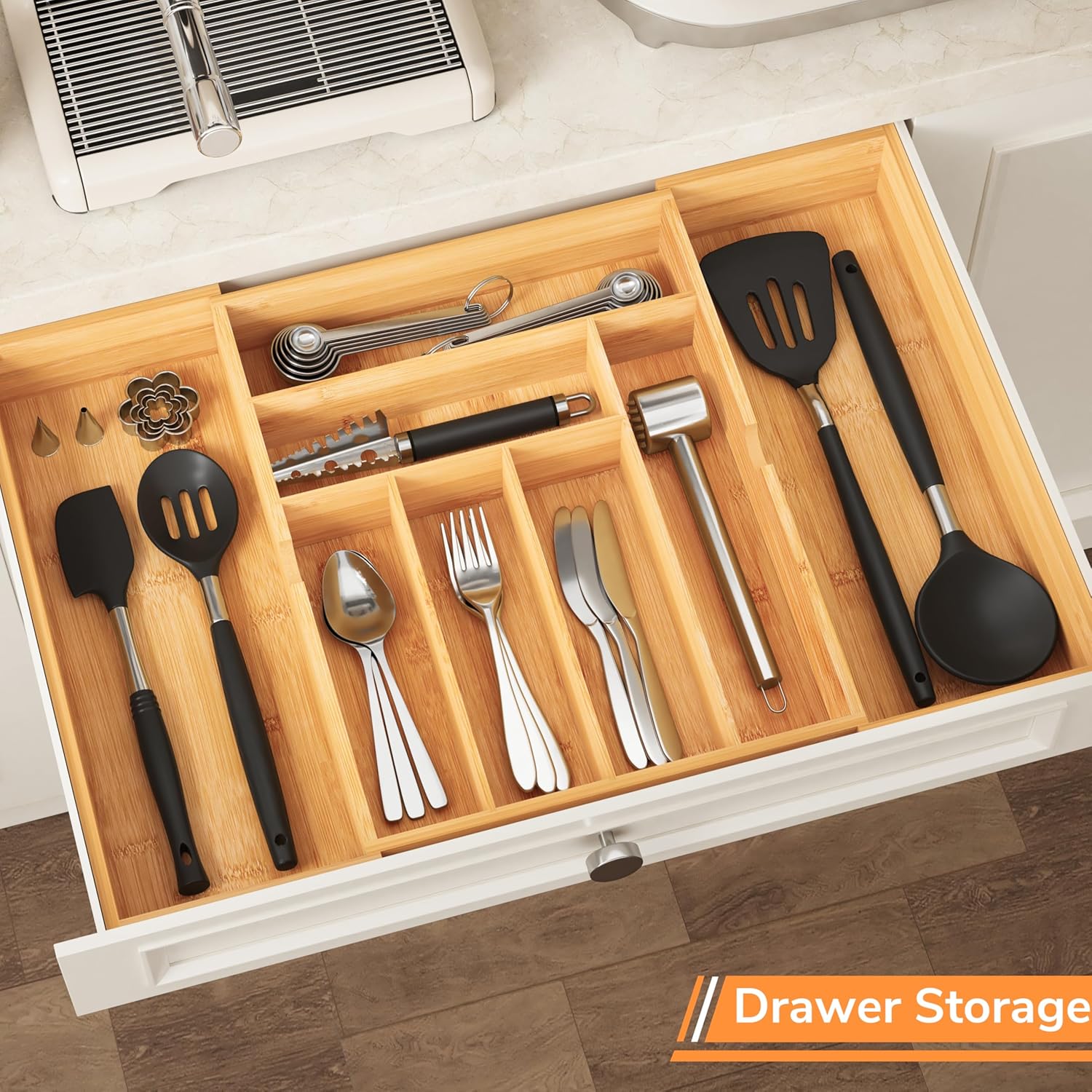 - Multi-functional Drawer Organizer: The utensil drawer organizer is perfect for organizing in a variety of scenarios, such as knives, forks, spoons and spice bottles in the kitchen; toiletries and toilet paper in the bathroom; skin care products and cosmetics on the dresser; pens and envelopes in the office; Try this organizer to keep your desktop and drawers free from clutter