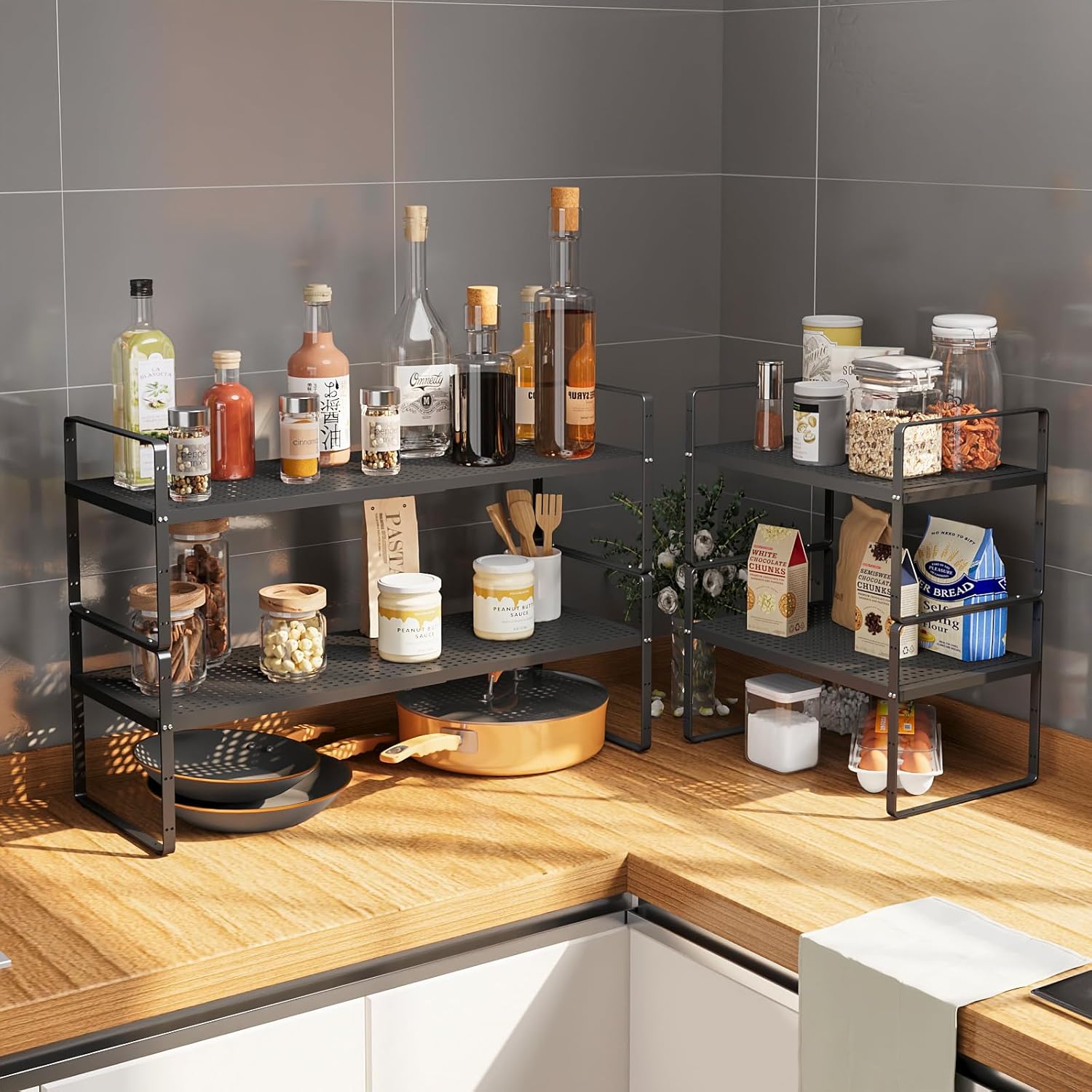 - Wide Range of Use:Cabinet shelf organizers can be stacked and used, one or more combined together. They can be placed in cabinets, food cupboards, on kitchen countertops or under the sink.