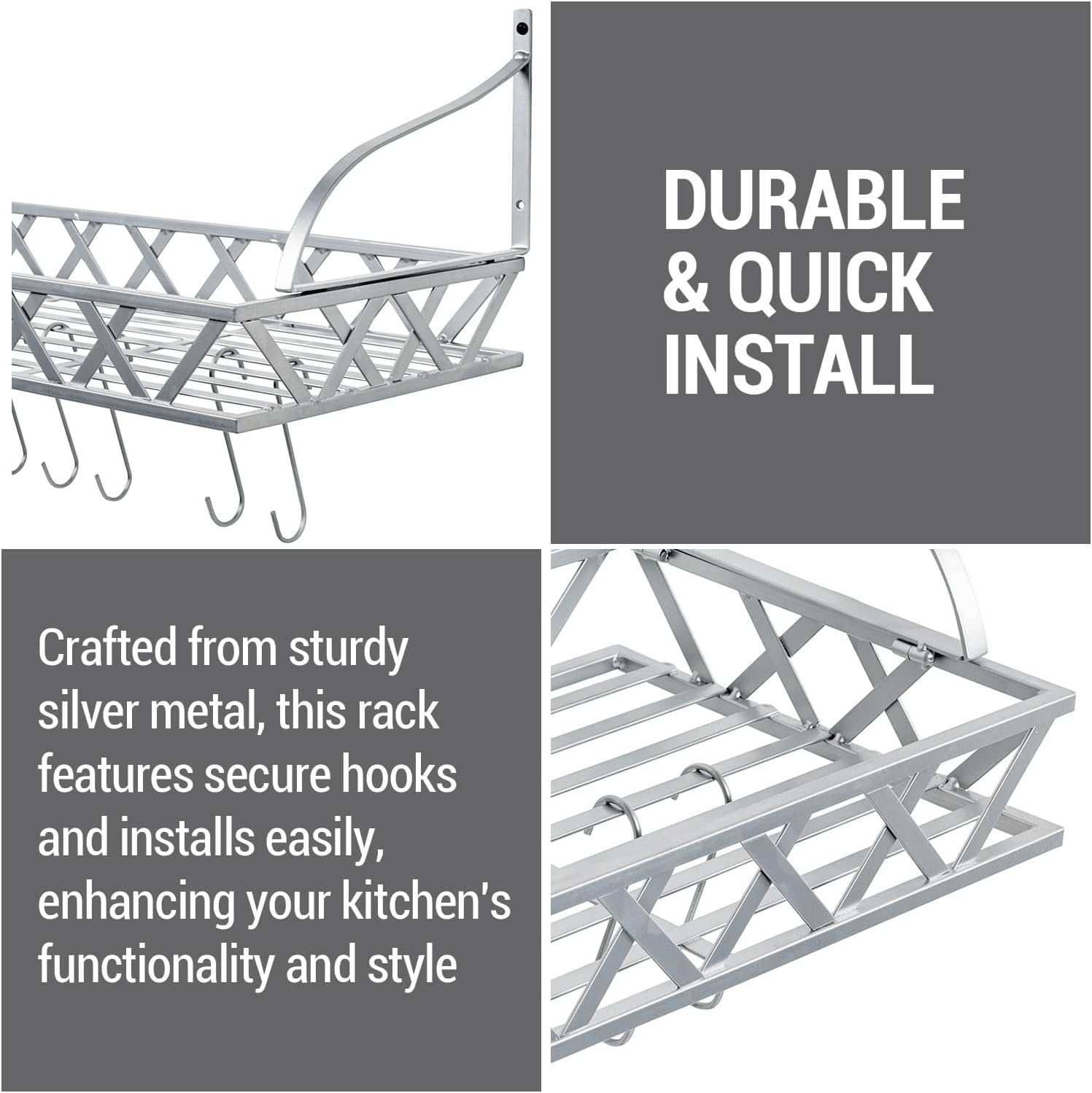 - Made from durable silver-tone metal, this rack offers reliable support for your cookware collection. Its industrial-grade strength ensures it can handle the weight of multiple pots, pans, and kitchen accessories without bending or sagging.