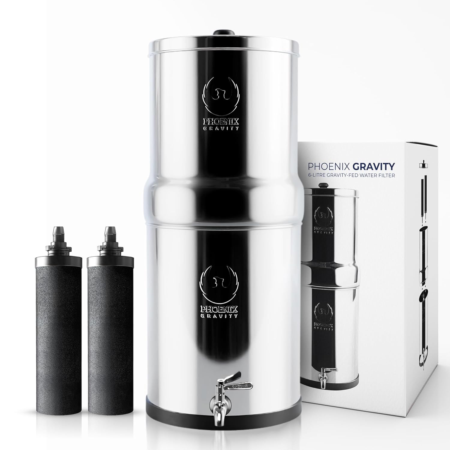 - 𝐀𝐥𝐥-𝐈𝐧-𝐎𝐧𝐞 𝐒𝐨𝐥𝐮𝐭𝐢𝐨𝐧 – The Phoenix Water Filter System includes a stainless steel tank, 2 Smart Carbon (Black) filter elements, a stainless steel spigot, and all required parts. Whether you need a countertop water filter system for your kitchen or a portable water filter for on-the-go use, it’s ready right out of the box.