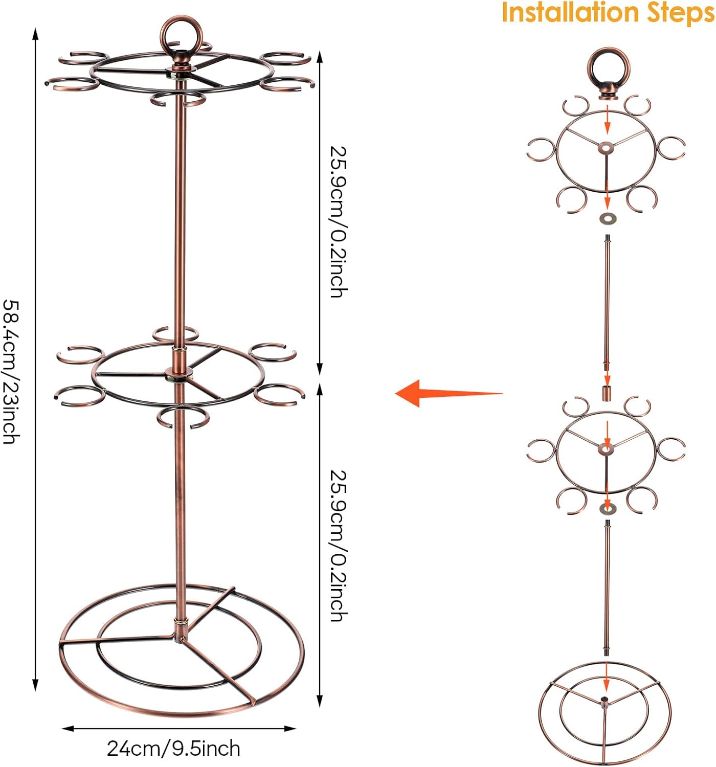 - Dimensions: 9.5" x 9.5" x 23". The rack only, other items are not included. It can server 12 wine glasses.