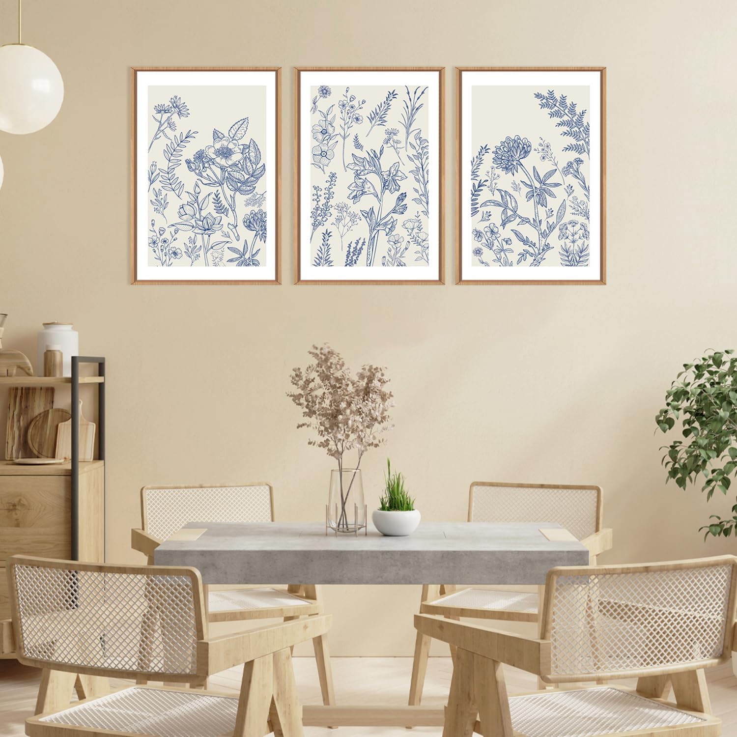 - 【Elegant Blue Botanical Wall Art】 The Size of the framed canvas wall art set is: 24x36 inchx3pcs (60x90cmx3pcs). This large set of blue botanical wall art features intricate floral details in a watercolor style, providing a serene and sophisticated visual effect that perfectly complements modern home decor.