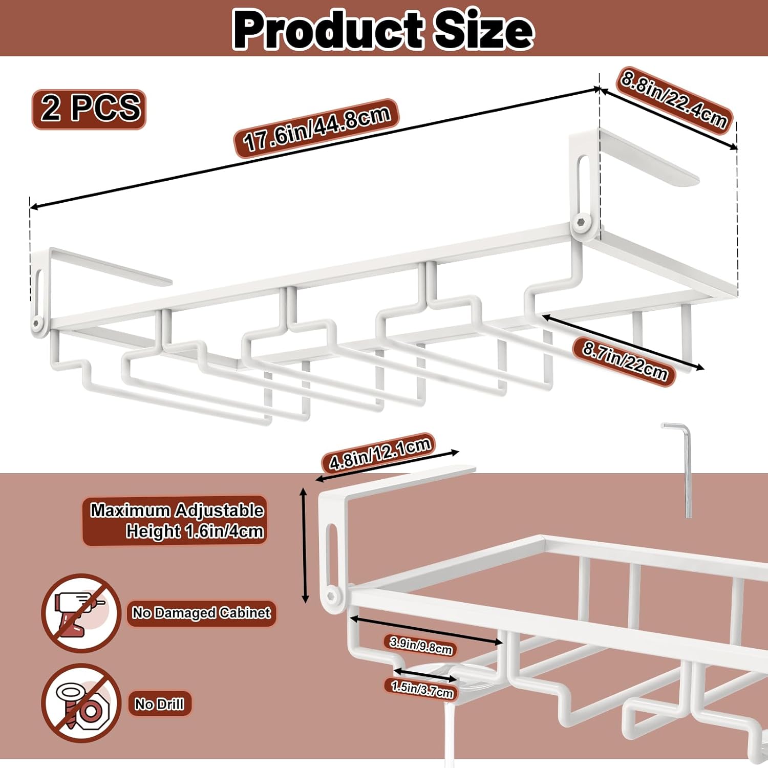 - 【Adiustable Wine Glass Rack】You can adjust the rack's mezzanine width to fit your cupboard, fit for 0.2-1.6in thickness(0.5-4CM). The perforation-free installation design makes the wine glass holder not only suitable for wooden partitions, but also for floating plates of different materials such as stone plates and glass partitions.