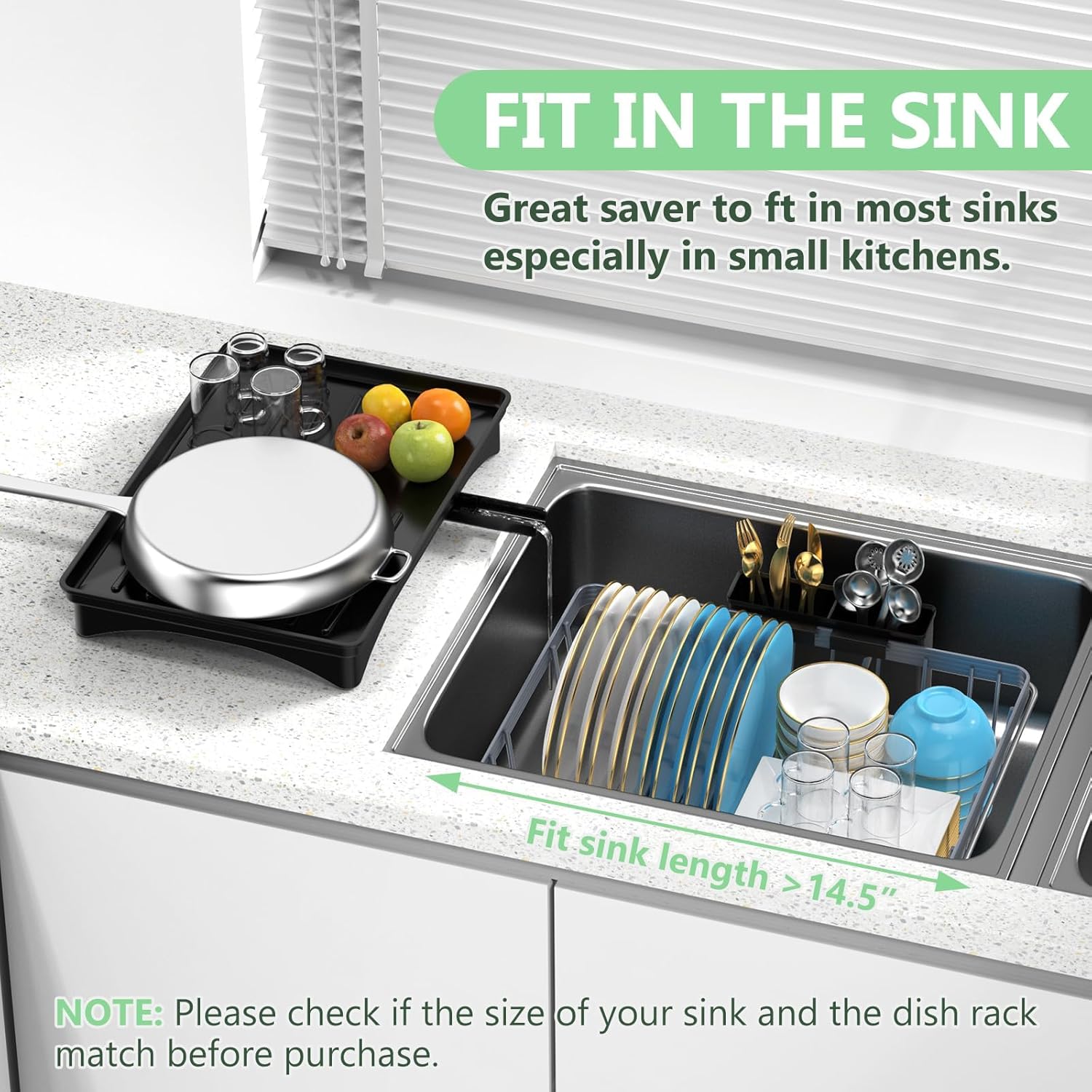 - EXPANDABLE DESIGN: LEMIKKLE expandable Dish Drying Rack Over The Sink measures 14.5"L x 10.6"W x 4"H (Please check the dimension before purchase, the size is mini), the supporting bars is adjustable from 14” to 19.2”. With the compact size and expandable design, this dish rack is a perfect choice for 2-3 people or limited space for use on the countertop, in-sink or over-sink
