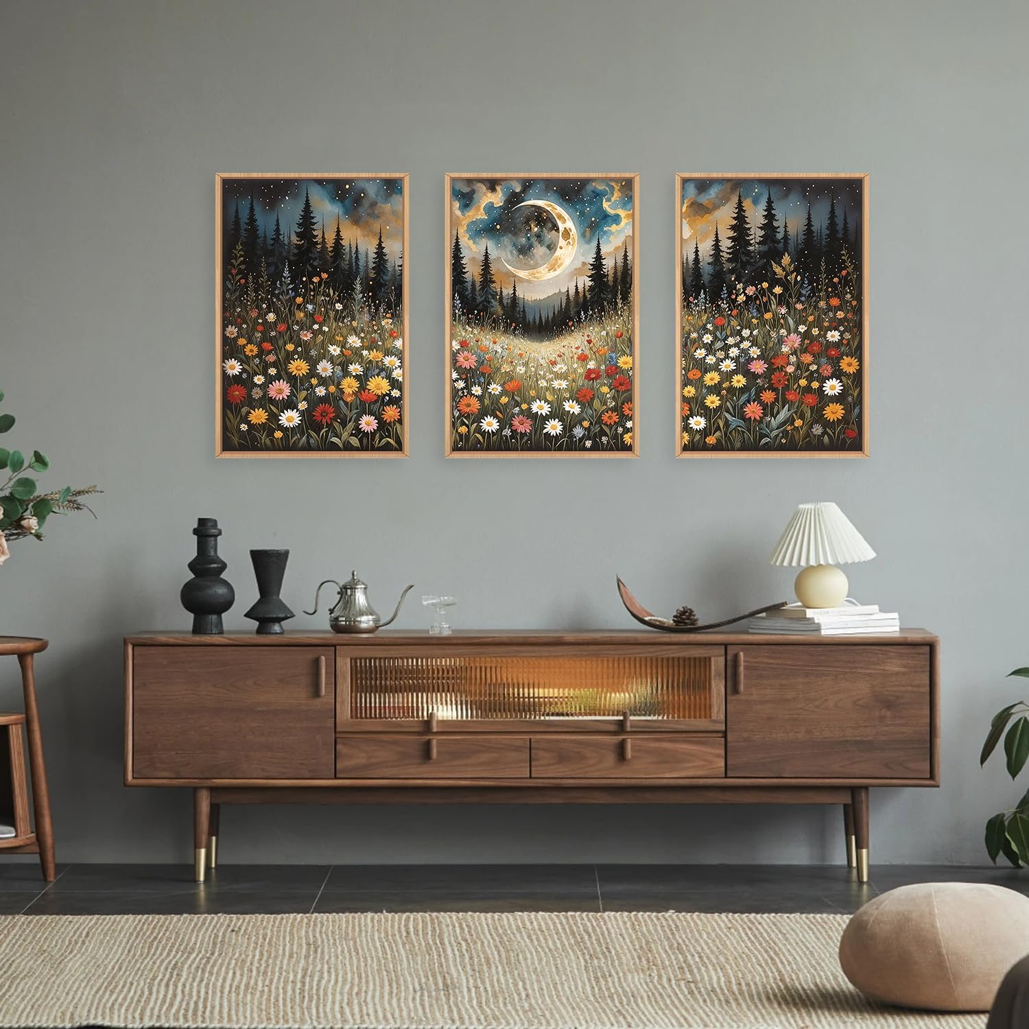 HPINUB Wildflower Moon Forest Framed Canvas Wall Art Set,Nature Pine Tree Wall Decor,Mystical Starry Night Artwork Rustic Mountain Landscape Art Print for Living Room,Bedroom,Office-16 x24 x3
