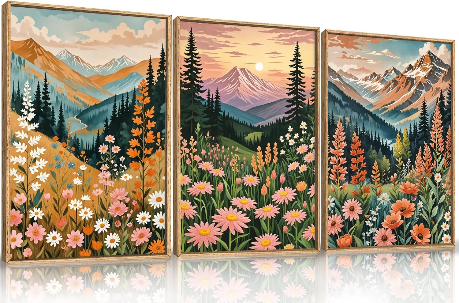 HPINUB Mountain Sunset Floral Framed Canvas Wall Art Set,Colorful Wildflower Daisy Flower Wall Decor,Boho Blossom Botanical Artwork Modern Nature Landscape Art Print for Living Room,Bedroom-24 x36 x3