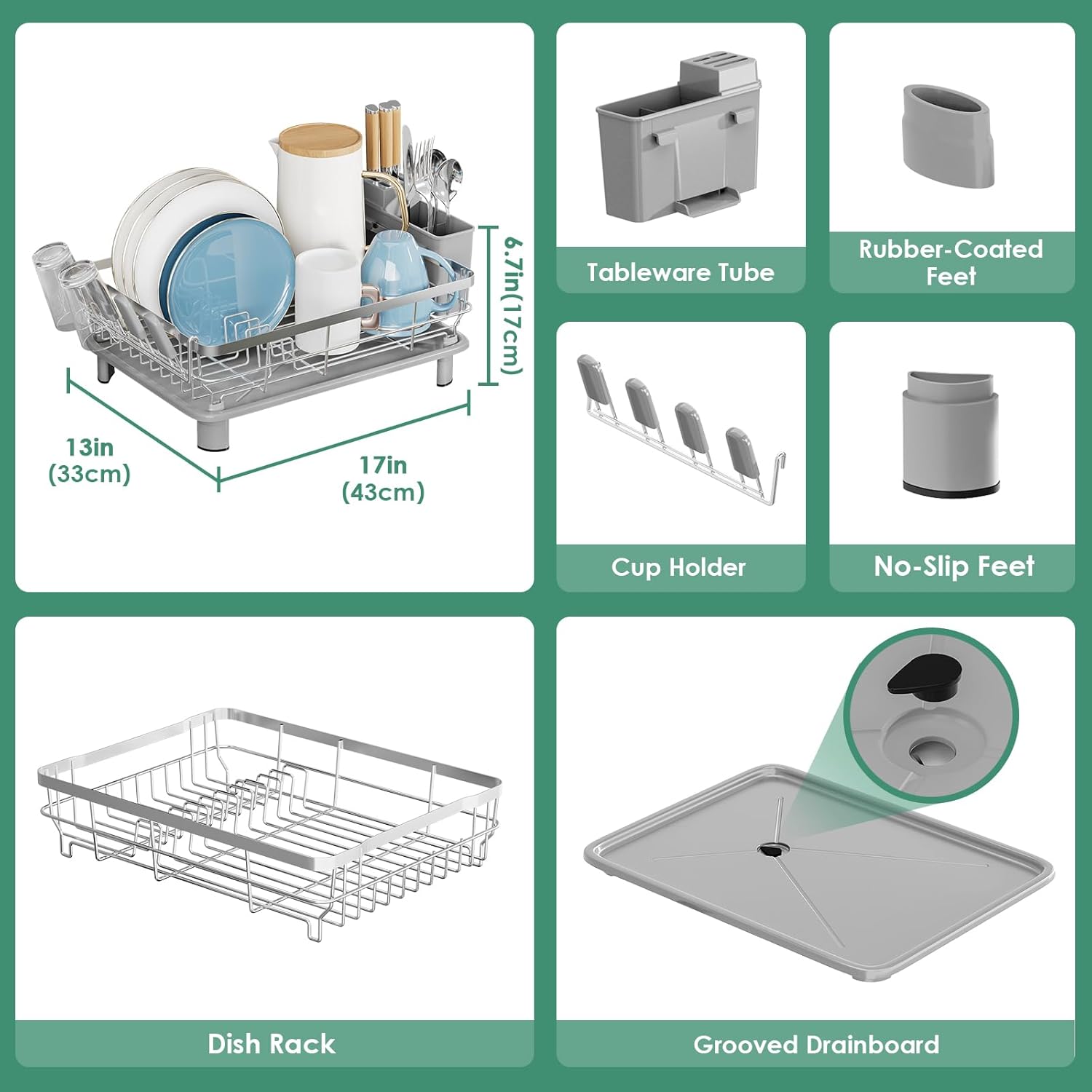 - πππππ ππππππππ: Our dish racks measures 17"D x 13"W x 6.7"H (43.5 D x 33.5W x 17 H cm), store 12 plates, 4 bowls, 6 cups or glasses and lots of tableware, the dish drainers for kitchen counter is large enough for a family of 4 to use daily