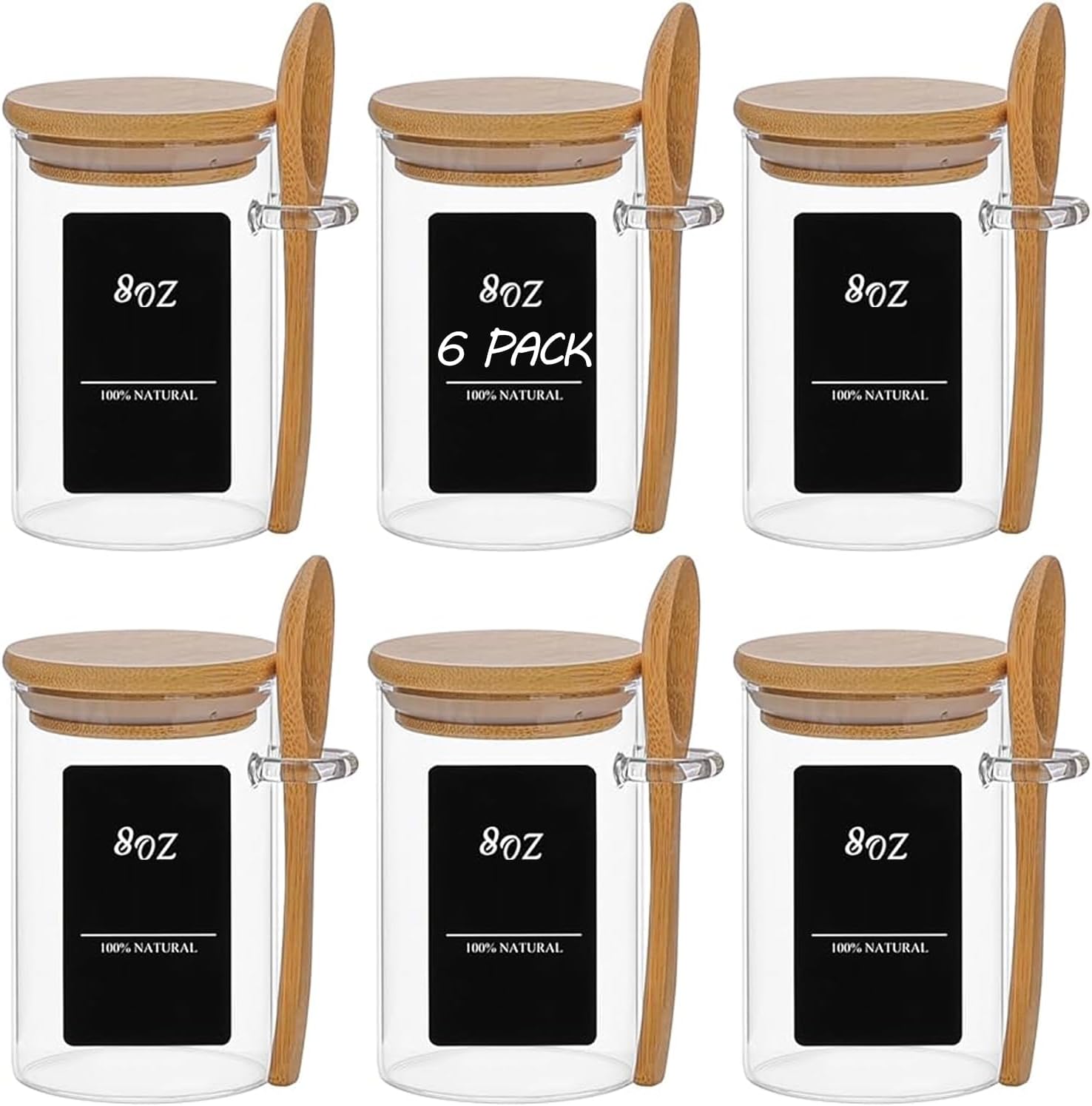 ComSaf Spice Jars with Spoon 8 oz 6Pack, Small Spice Containers Starter Set, Glass Seasoning Jars with Labels, Round Seasoning Containers for Salt, Pepper, Chili Powder, Sugar, Loose Tea Storage