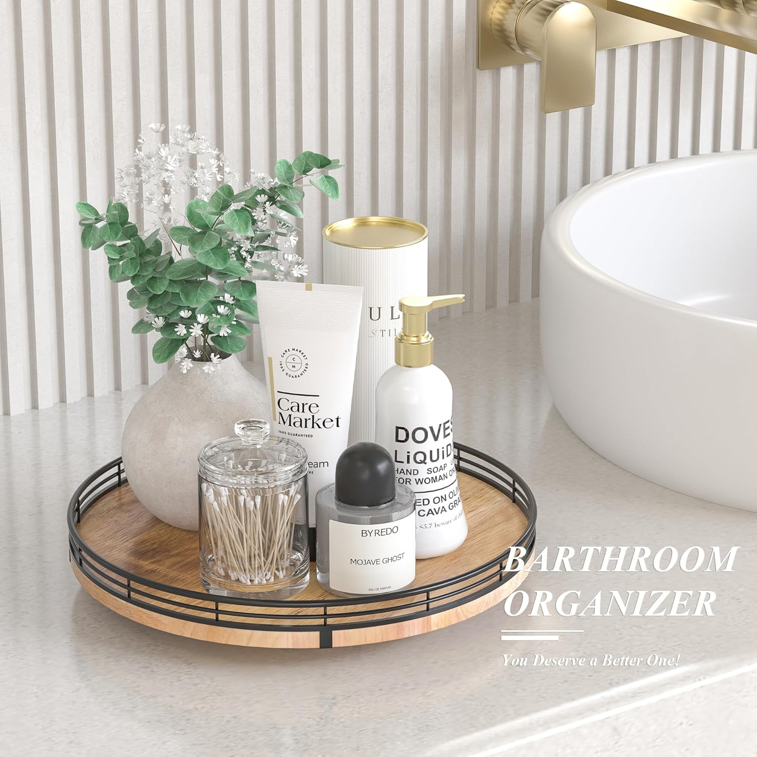 - UPDATED DESIGN: With larger wood base on this lazy Susan for table top, the turntable organizer doesn't wobble, even with heavier items on it. With premium oak wood and classical iron fence make this lazy Susan turntable stylish, functional and adding a touch of rustic charm. it’s also very easy to clean. There are included anti-slip pads on the bottom of the lazy Susan for extra surface protection.
