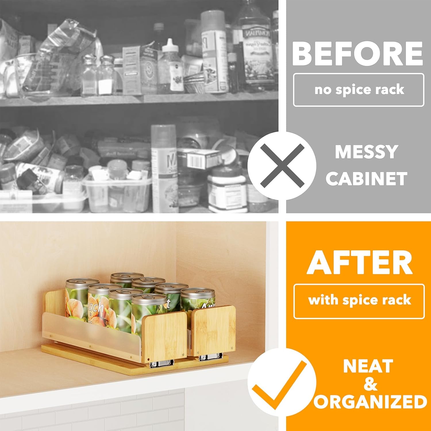 - DURABLE MATERIAL TO LAST - Crafted from premium quality bamboo, this slide out seasoning organizer is built for long-lasting use; Our space-saving spice rack complement your home storage system and maximize cabinet space efficiency