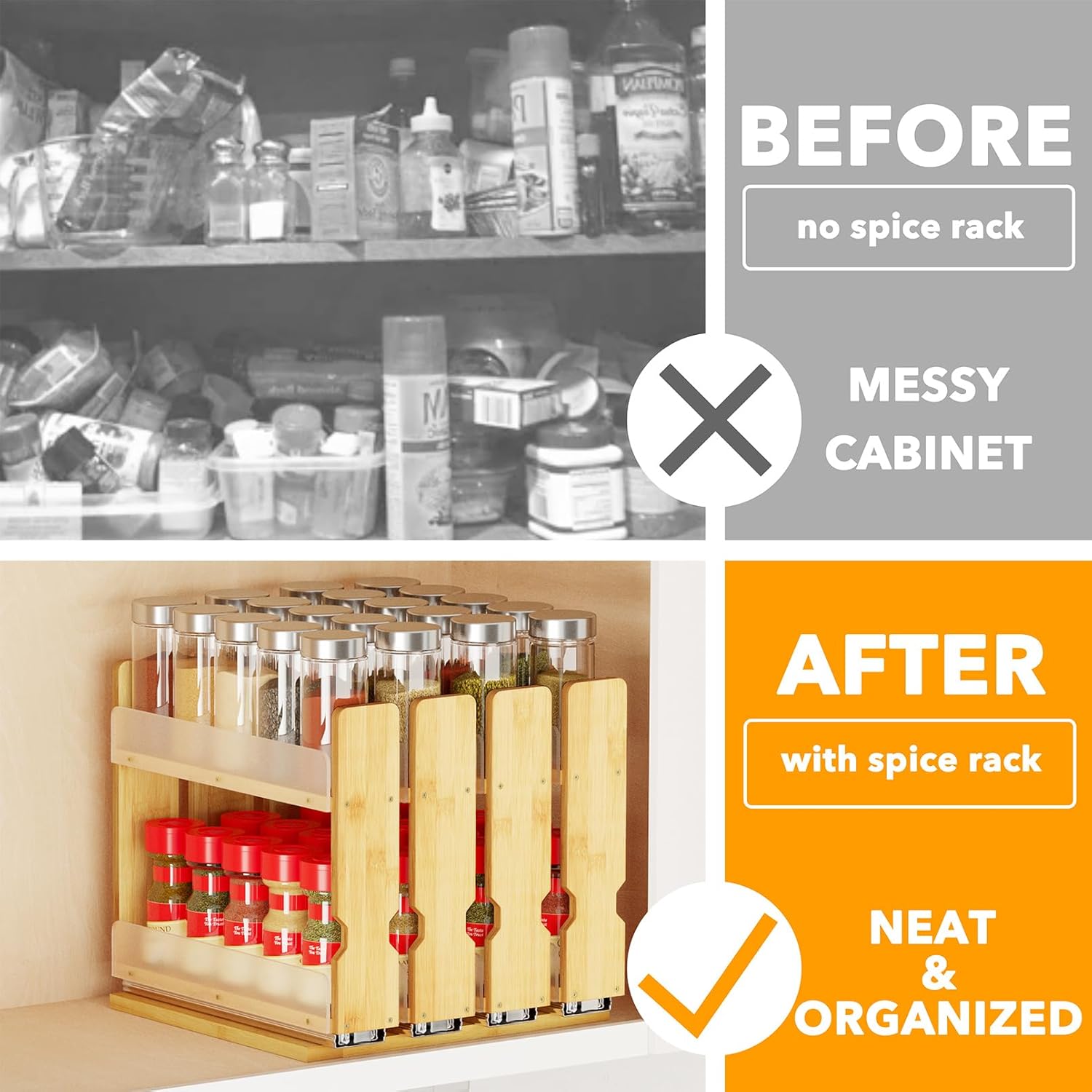 - DURABLE MATERIAL TO LAST - Crafted from premium quality bamboo, this slide out seasoning organizer is built for long-lasting use; Our space-saving spice rack complement your home storage system and maximize cabinet space efficiency
