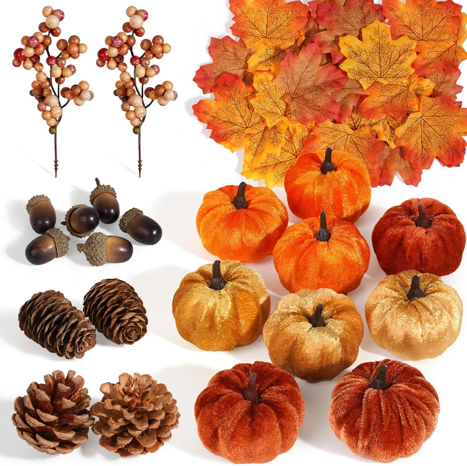 - There are 9 pumpkins with 3 different colors, 30 pieces of assorted maple leaves, 4 pieces of pine cones, 6 pieces acorns, 2 pieces of autumn orange berry stems. There are 51 items in total, which can meet your various needs.