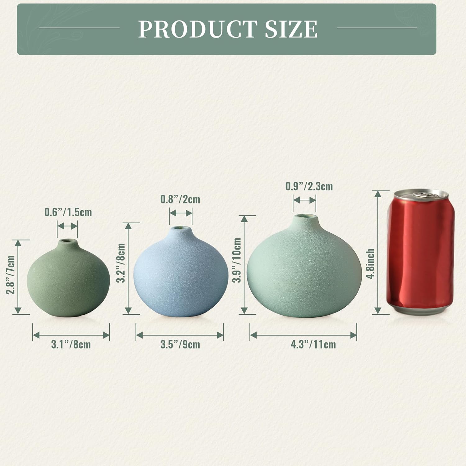 - 【Vase Set of 3】 This set includes three ceramic vases in sizes 4.3" x 3.9", 3.5" x 3.2", and 3.1" x 2.8". Perfect as a centerpiece for your table or displayed individually, these vases bring modern farmhouse warmth and minimalist charm to any room.