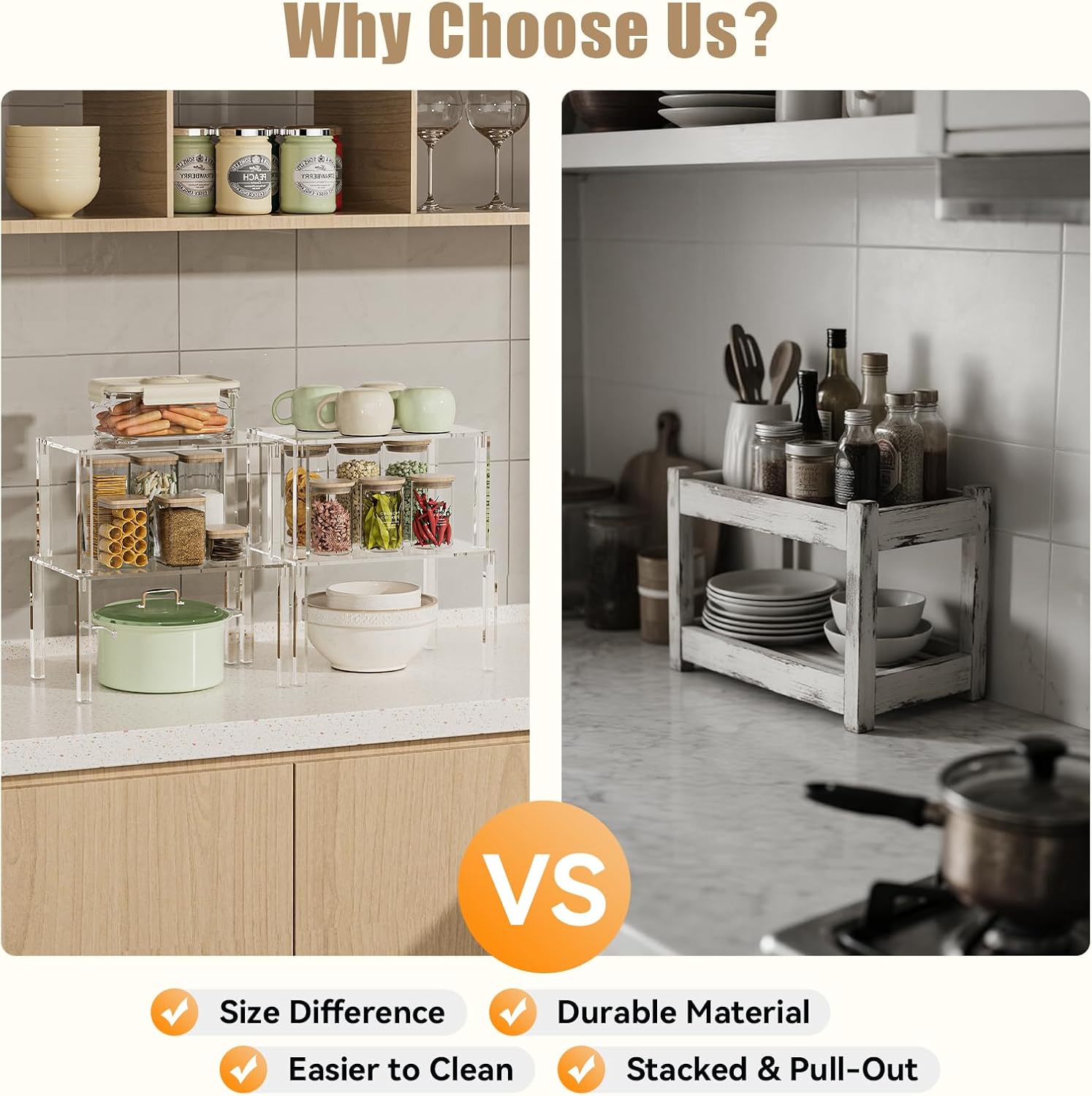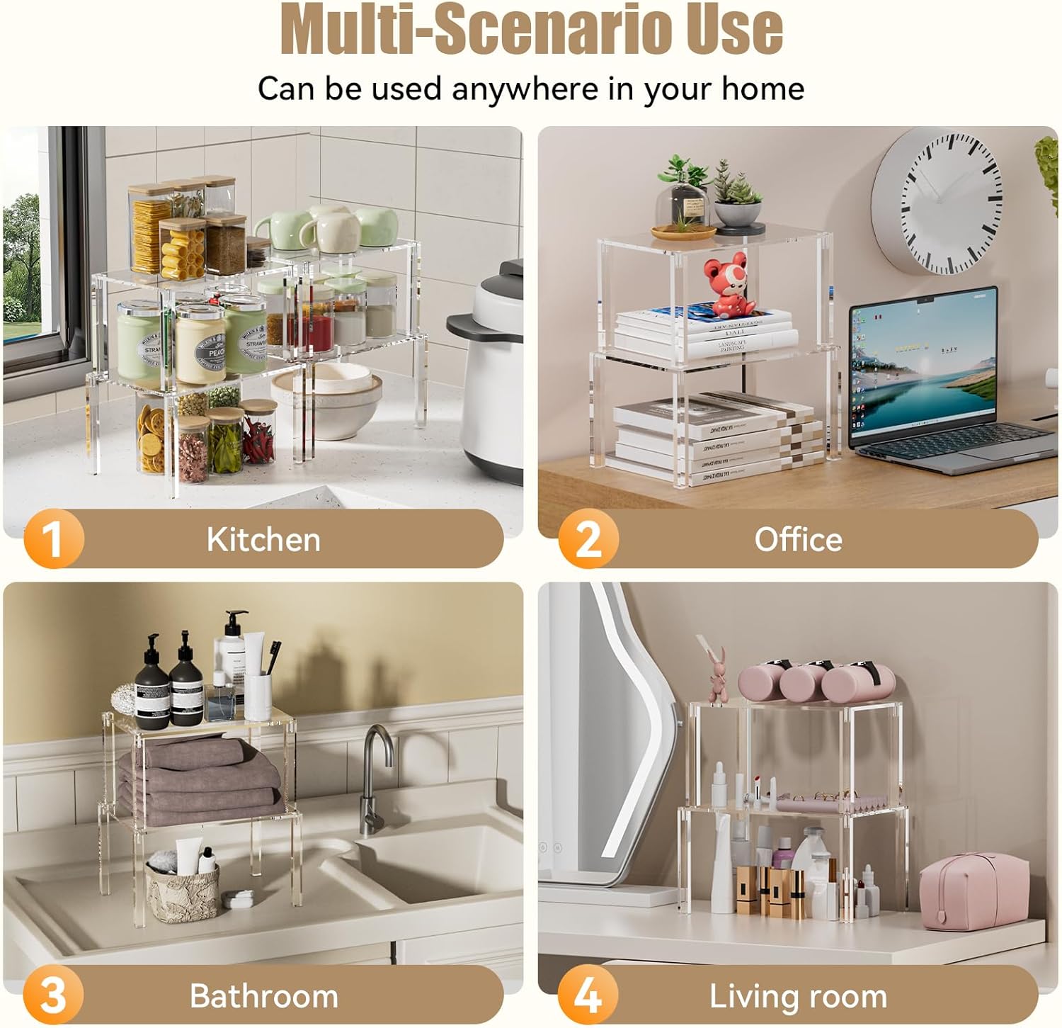 - Maximizes Vertical Space & Organizes Efficiently - Set of 4 acrylic shelves creates dual-layer storage in cabinets, perfectly holding spices, plates, jars, and mugs. Save 50% kitchen space with this counter shelf organizer—keep essentials visible and neatly displayed!