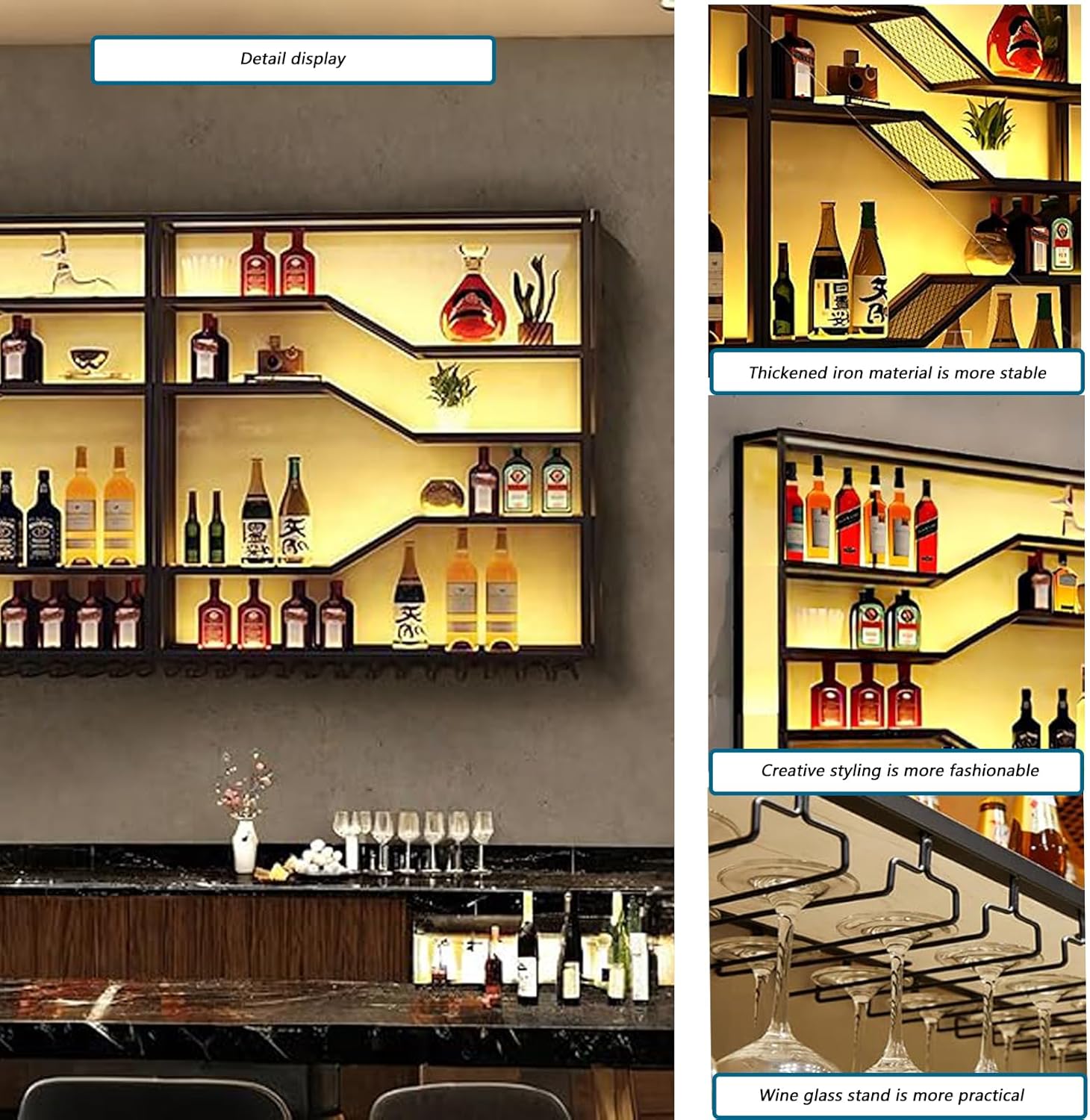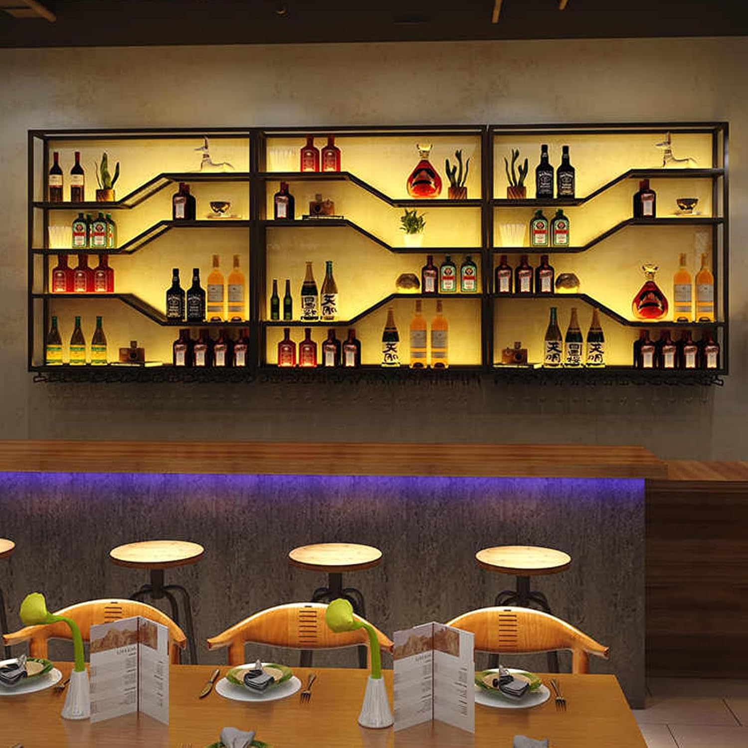 - LED LIGHTS ENHANCE YOUE WINE DISPLAY: Showcase your wine collection with this wall-mounted metal wine rack, featuring built-in LED lights for a stunning visual effect.After receiving the light strip, stick it along the edge of the wine rack and plug it directly into the socket for use. (It is more convenient and safer than wiring it yourself)