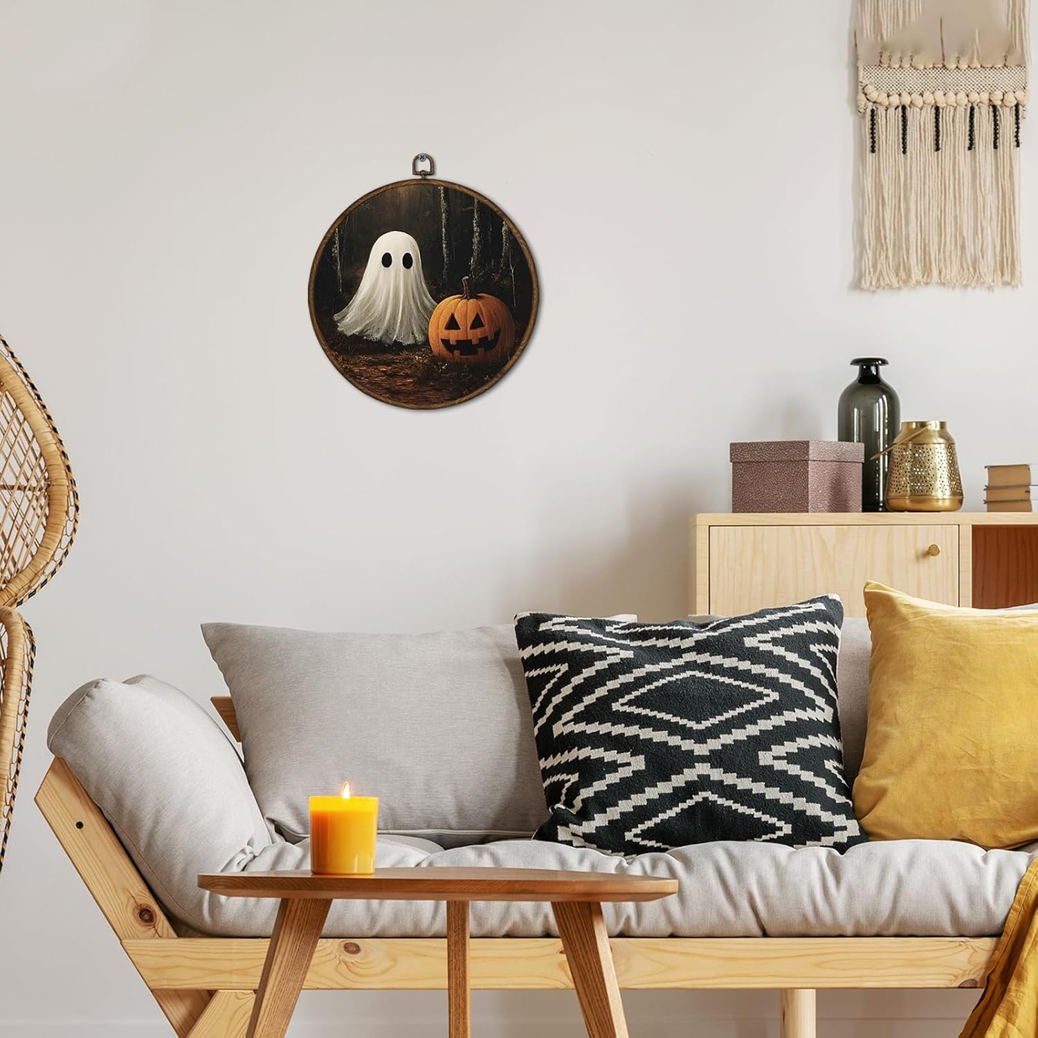 cvjutf Vintage Ghost Halloween Wall Art Framed, Ghost Bathroom Decor, Gothic Dark Academia Fall Round Wall Decor, Witchy Halloween Pumpkin Canvas Prints Art for Bedroom Bathroom Living Room, 10x10 In
