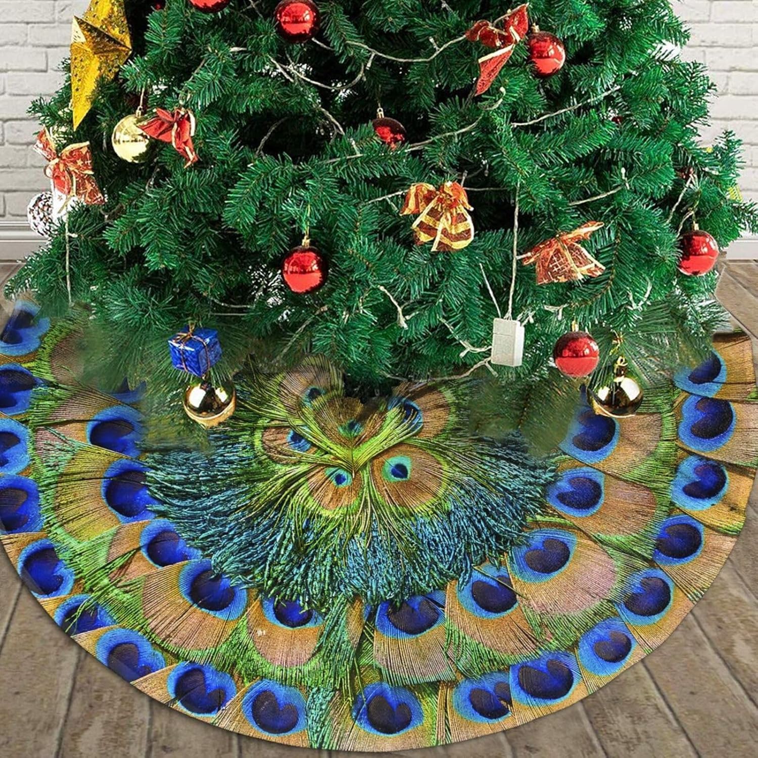 Christmas Tree Skirt,Peacock Feathers Circle Xmas Tree Skirt Rustic Farmhouse Tree Skirt for Christmas Decor Xmas Holiday Home Party Decorations30